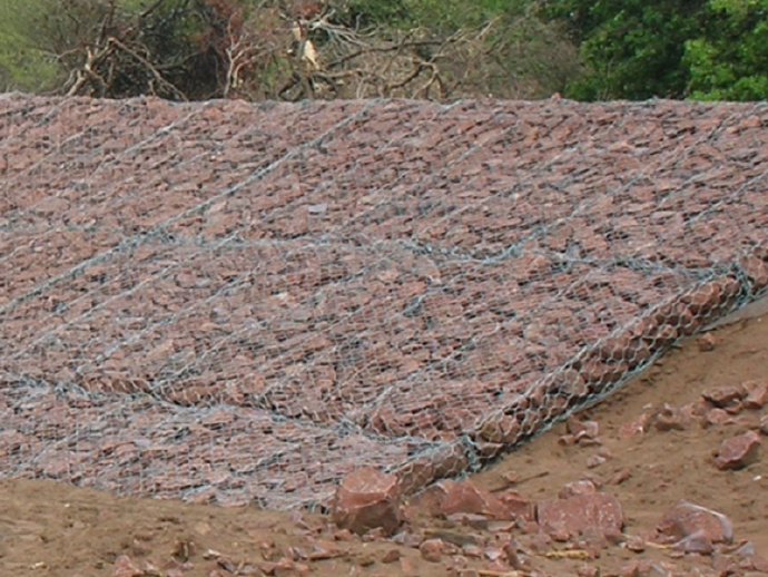雷諾護(hù)墊是指由機(jī)編雙絞合六邊形金屬網(wǎng)面構(gòu)成的厚度遠(yuǎn)小于長(zhǎng)度和寬度的墊形工程構(gòu)件,其中裝入塊石等填充料后連接成一體,成為主要用于水利堤防、岸坡、海曼等的防沖刷結(jié)構(gòu),具有柔性、對(duì)地基適應(yīng)性的優(yōu)點(diǎn)。