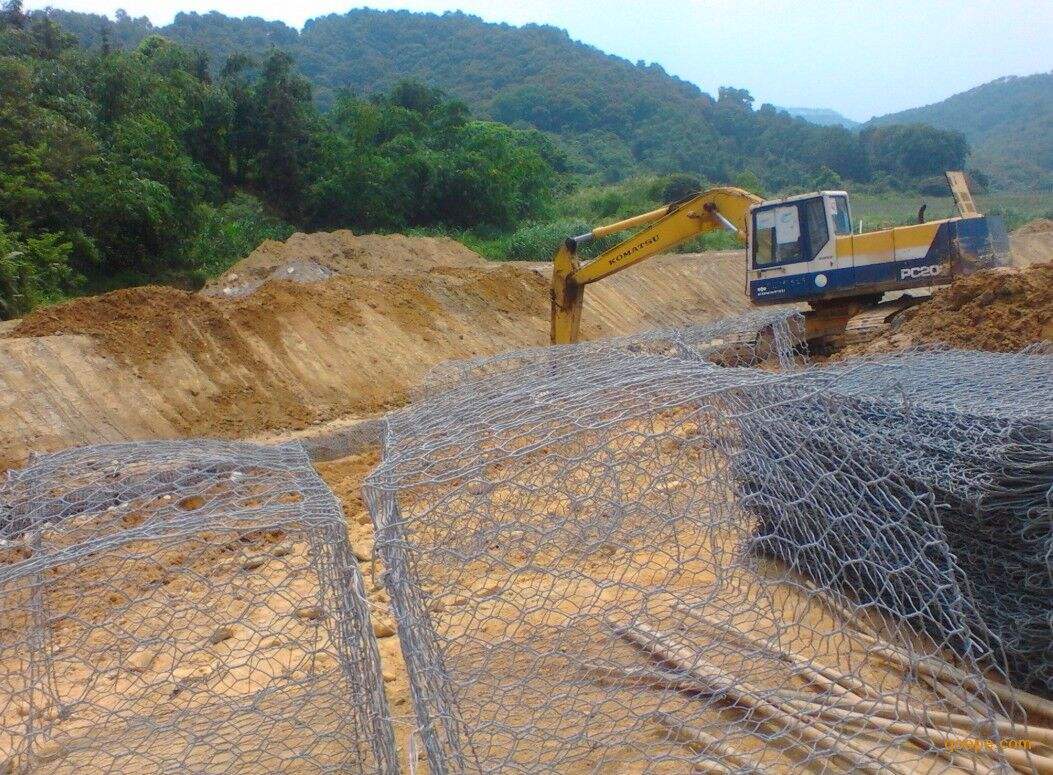 5)放置 綁好后,用機器小心將石籠網(wǎng)一個一個或兩個兩個的吊放到恰當位置。為了保證質(zhì)量,石籠網(wǎng)縫邊、組裝時應(yīng)用較粗的邊絲和綁絲。