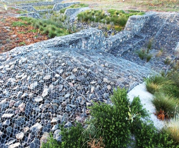固濱籠是由高抗腐蝕、高強度、具有延展性的低碳鋼絲或許包覆PVC的以上鋼絲運用機械織造而成,依據(jù)ASTM A 975和EN10223規(guī)范,所運用的低碳鋼絲直徑依據(jù)工程設(shè)計需求而不一樣。通常介于2.0-4.0mm之間,鋼絲的抗拉強度不少于38kg/m2,金屬鍍層分量通常高于245g/m2格賓網(wǎng)片的邊際線直徑通常要大于網(wǎng)線直徑。其雙線絞合有些的長度不得小于50mm.以確保絞合有些鋼絲的金屬鍍層和PVC鍍層不受損壞。