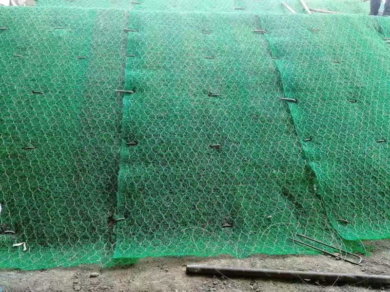 加筋麥克墊是采用聚丙烯的三維土工墊和六角格賓網(wǎng)(表面鍍10%鋅鋁合金鋼絲)組合而成,能夠提升綠化植物在生長初期的生長環(huán)境和土壤的抗風(fēng)化、雨水的侵蝕能力。防止被施工護(hù)坡的坡面被風(fēng)力、雨水、地面河流侵蝕,又增強(qiáng)了綠化植物生長起來以后對根系的固定作用。 加筋麥克墊是結(jié)合U型錨釘和綠化草籽來使用的。U型錨釘為直徑8毫米的鋼筋錨釘,草籽可以選擇生長周期快,綠化能力、抗惡劣環(huán)境強(qiáng)的草籽,草籽使用噴播的方式種植。